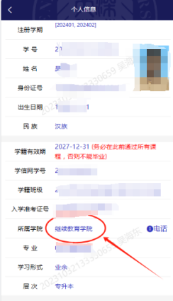 所属学院的查询方法:登录“深大成教”微信公众号,点击“个人信息”,“所属学院”一栏显示为“继续教育学院”