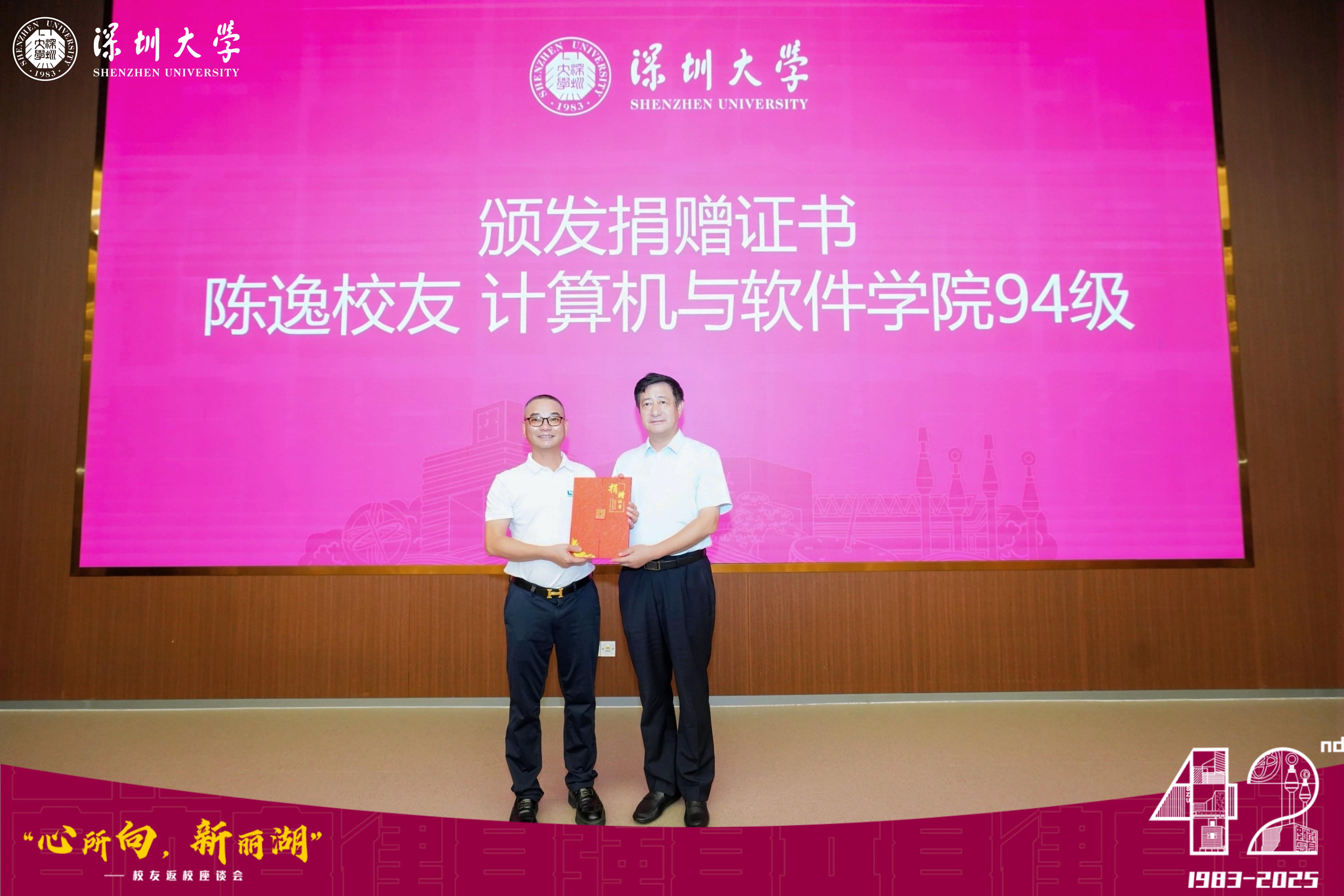 捐赠仪式环节,会上介绍了近年校友捐赠成果,校领导向捐赠代表颁发荣誉证书。捐赠校友代表、计算机与软件学院1994级校友陈逸发言,他提及母校对个人职业发展的重要影响,表示支持母校建设是校友义不容辞的责任,希望通过捐赠为母校人才培养、学科建设等方面略尽绵薄之力,也期待更多校友能参与到支持母校发展的队伍中来。