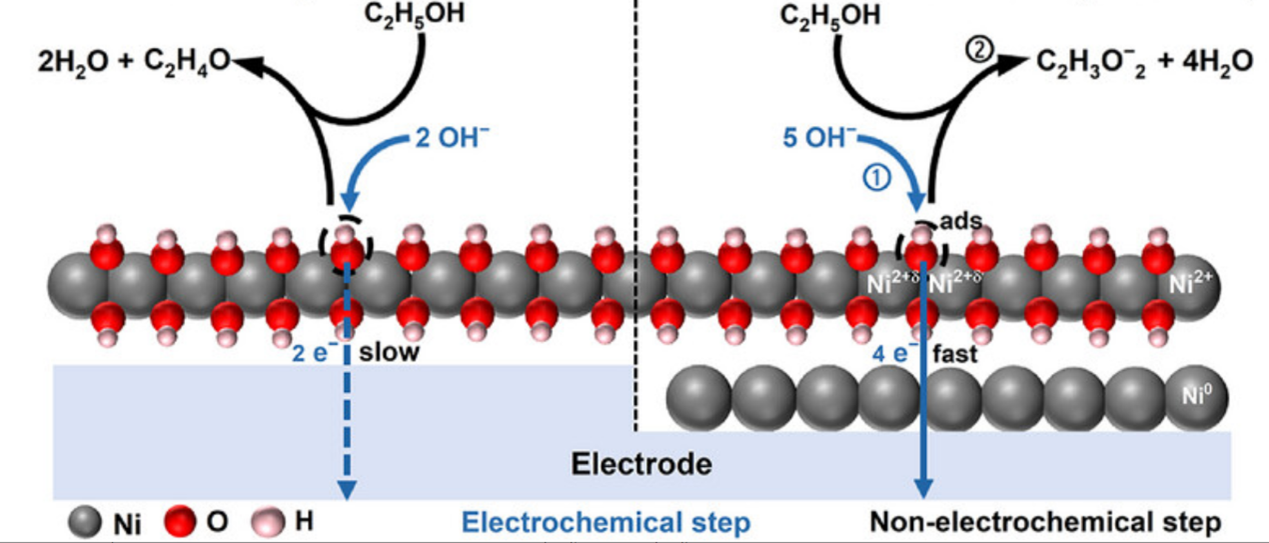 图1. 通过电沉积过程中的亲水-疏水表面调控形成的Ni0/Ni2+异质结构,增强Ni2+ ⇔ Ni3+的价态转换,降低乙醛氧化的动力学势垒,并提升乙醇转化乙酸盐的效率