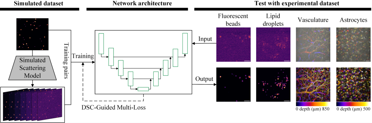 2、首次采用动态范围的散射系数(而非固定值)来模拟活体组织的异质性,从而生成更贴近真实生物环境的训练数据。可以避免对大量高质量真实配对数据的依赖,有效降低了数据获取成本。此外,该方法可适用于较低激光功率(15-30 mW)下的成像,显著减少对活体样本的光损伤,更适合长期动态观测研究。