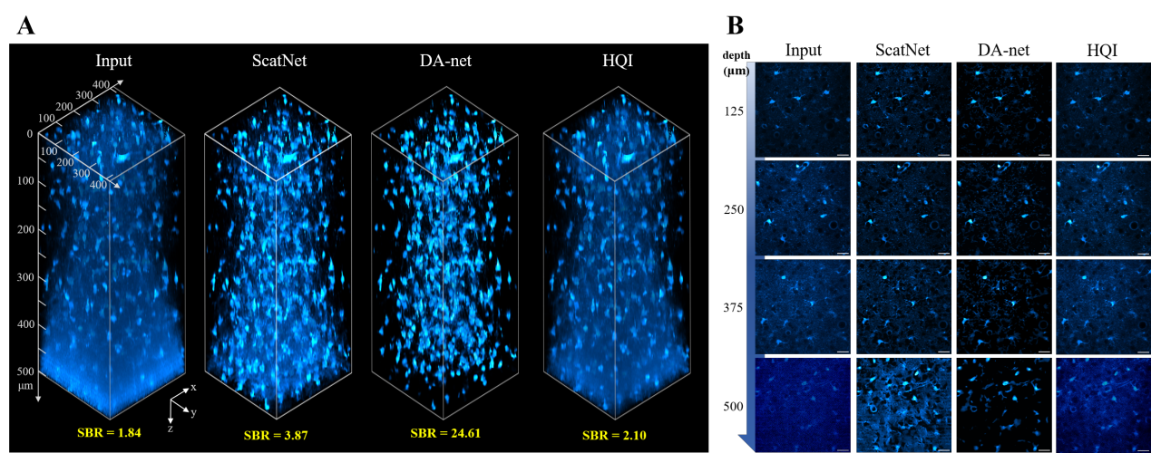 图3. DA-net对深层活体鼠脑胶质细胞TPEF图像的去散射和复原结果