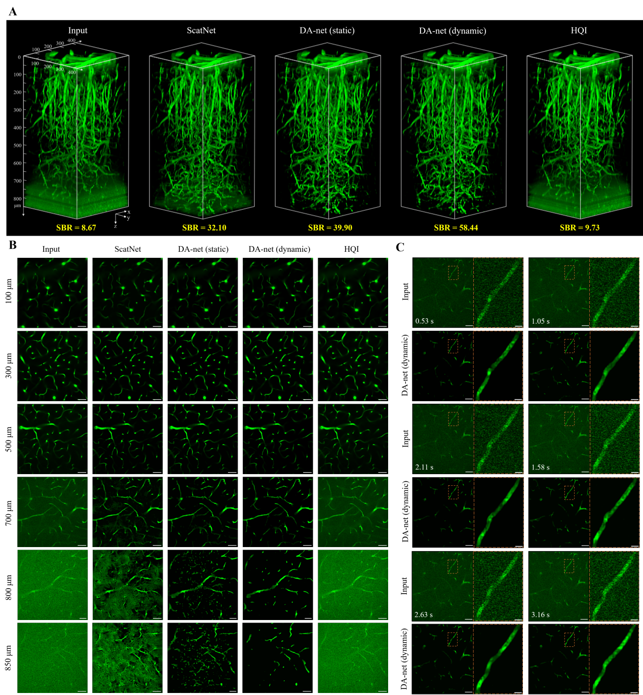 图2. DA-net对深层活体鼠脑血管TPEF图像的去散射和复原结果