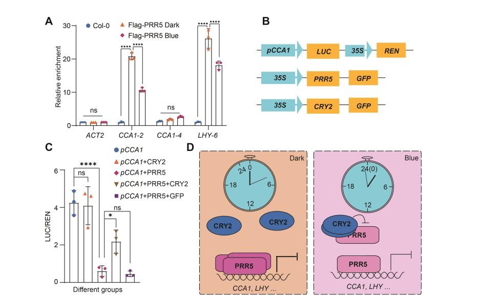 进一步的转录组分析揭示,CRY2和PRR5能够拮抗调控大多数生物钟基因的表达,其中包括CCA1和LHY。染色质免疫沉淀(ChIP)和双荧光素酶报告基因(Dual-LUC)实验结果表明,蓝光和CRY2可以抑制PRR5的转录抑制能力,从而促进CCA1等生物钟基因的表达(图3)。