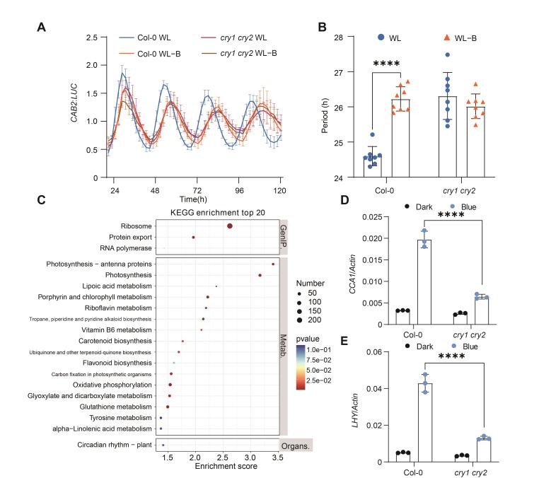 在本项研究中,研究人员成功鉴定出一个与蓝光受体CRY2具有蓝光依赖性相互作用的生物钟核心转录因子PRR5,并深入探究了蓝光通过CRY2-PRR5模块对植物生物钟进行调控的机制。研究结果表明,蓝光及其受体CRYs对于植物维持正常的生物钟周期至关重要。在cry1 cry2双突变体中,观察到生物钟周期显著长于野生型,且这种差异呈现出明显的蓝光依赖性。此外,转录组分析揭示,在野生型与cry1 cry2突变体之间,生物钟相关基因的表达存在显著差异。特别是生物钟核心转录因子CCA1和LHY的表达水平,受到蓝光和CRYs的显著促进(图1)。