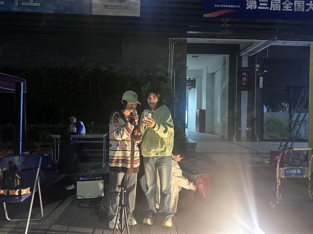 活动伊始,随着第一束舞台灯光亮起,正义广场的露天舞台正式开唱。SOS音社成员轮番带来《我的未来不是梦》《骄傲的少年》等青春励志金曲,激昂的旋律瞬间点燃现场气氛;随后《稻香》《朋友》等温暖治愈的曲目缓缓响起,不少同学自发打开手机闪光灯,点点光斑随节奏摇晃,宛如一片“星光海洋”;当《追梦赤子心》《飞得更高》的副歌响起时,全场更是掀起大合唱热潮,歌声穿透暮色,传递着深大学子的热血与朝气。20余首精心挑选的歌曲,从抒情到燃炸,每一段旋律都精准戳中青春共鸣,路过的同学纷纷驻足加入“听歌阵营”,将不大的广场围得满满当当,形成一片热闹的“音乐圈”。