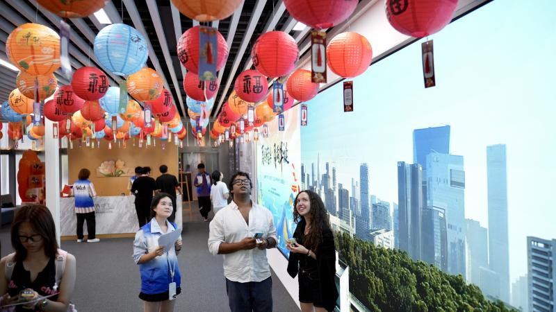“‘荔’刻启程”祝福墙前更是热闹非凡。中外学生并肩驻足,中国学生写下“国庆快乐,中秋团圆”的祈愿,外国学生学着用汉字书写“快乐”,还附上法语祝福,一张张彩色便签贴满墙面,宛如彩虹映荔园。不同语言的祝愿交织,既藏着对双节的庆贺,也让跨国情谊在笔墨间悄然升温,秋风拂过,满墙心意皆是温暖。